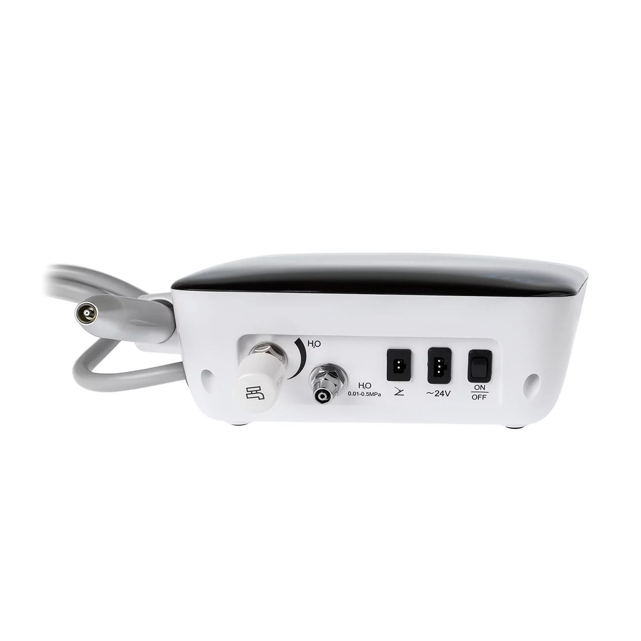 На задней части корпуса устройства имеется разъём для подключения к внешнему водоснабжению, что позволяет проводить стоматологические манипуляции без остановки.
