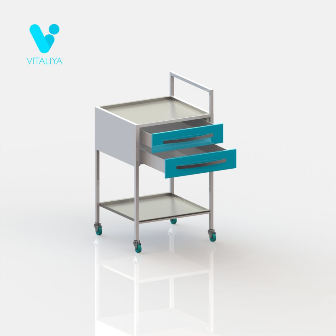 Стол оснащён двумя ящиками. Рабочая поверхность и полки могут быть выполнены из нерж.стали, либо металла. Стол установлен на колёса диаметром 50мм, два колёса с тормозом. Ящики могут комплектоваться пластиковыми вкладышами на 2 и 4 места.