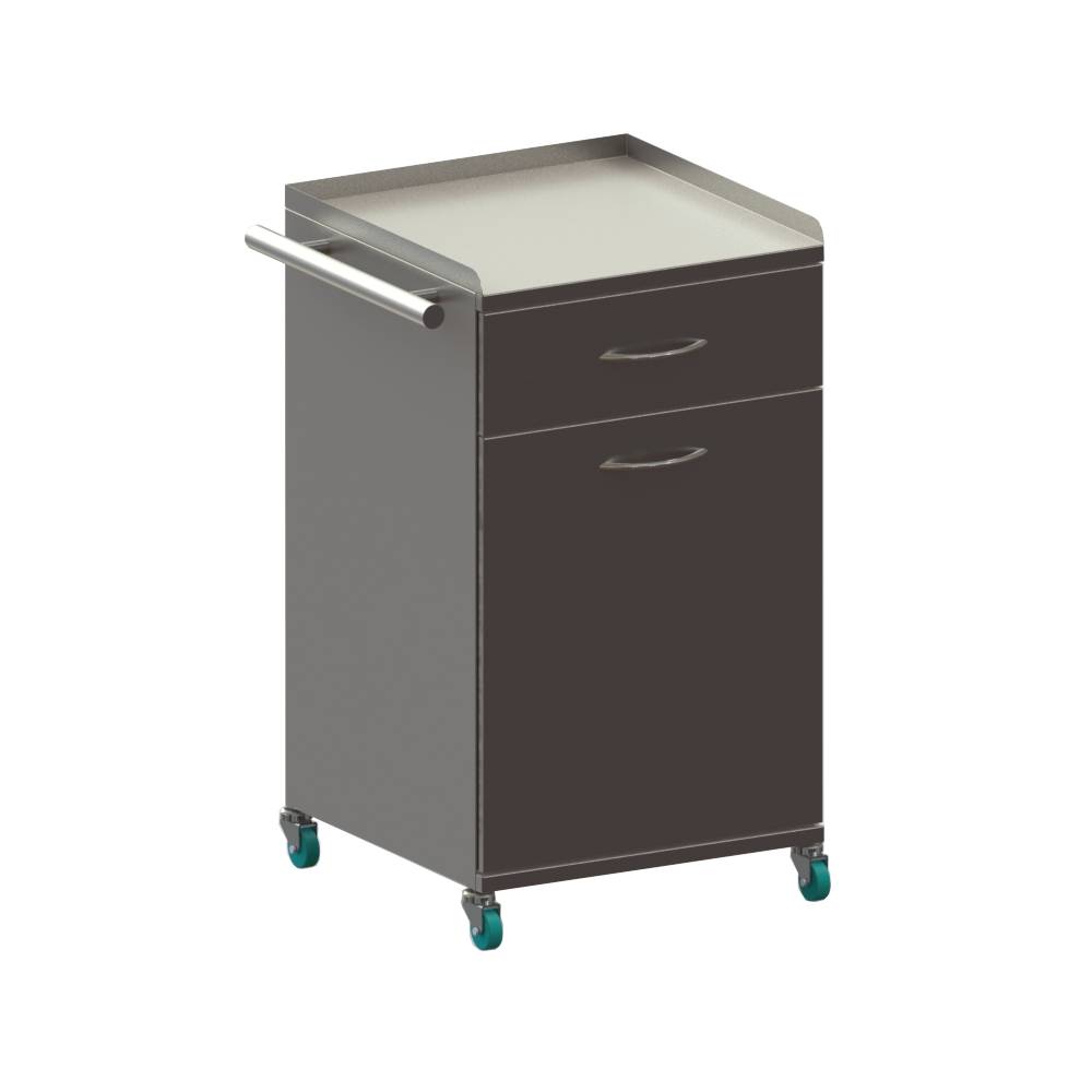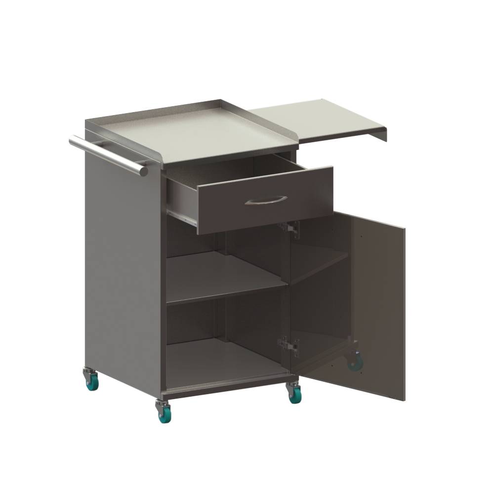 Столешница с бортиком. Сбоку ручка для перемещения. С др. стороны выдвижная полка. Резиновые колёса d 75 мм, два колеса с тормозом.