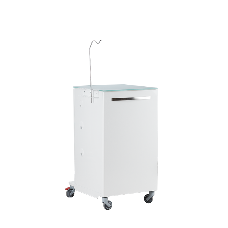 С тремя выдвижными полками. Столик оснащён специализированным держателем для стоматологических наконечников, а также штативом для крепления системы подачи физ.раствора. Столик установлен на колёса диаметром 75мм, два колеса с тормозом.